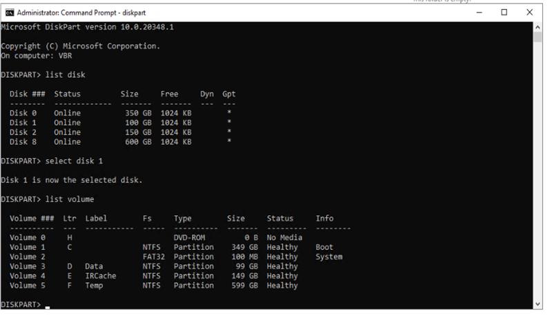 If the boot drive doesn’t have a drive letter in DiskPart, select the correct volume number as appropriate. Here we assign the drive letter T: