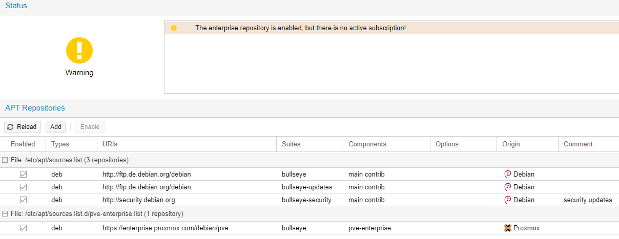 Now select the enterprise repository (last line) by clicking on it and clicking Disable.